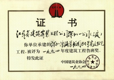 本工程在施工中能精心組織,通過(guò)QC小組活動(dòng),嚴(yán)格把關(guān)工程9個(gè)分部全部?jī)?yōu)良。在1993年的深圳市優(yōu)質(zhì)樣板評(píng)選中名列第一,同時(shí)榮獲1994年江蘇省金牌獎(jiǎng)和1994年建設(shè)部部?jī)?yōu)獎(jiǎng),1994年建筑工程魯班獎(jiǎng)。