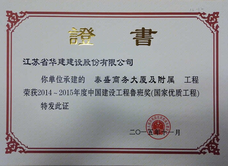 泰盛商務大廈及附屬工程地處秦皇島市經濟開發(fā)區(qū)核心位置,集商務辦公、會議中心、一站式服務大廳及報告演藝廳等功能為一體的綜合類商務辦公樓,地下1層,地上23層,裙樓兩層,建筑面積90148㎡,建筑高度97.75米。工程先后榮獲全國建筑業(yè)綠色施工示范工程、江蘇省新技術應用示范工程、江蘇省省級工法、河北省結構優(yōu)質工程獎、河北省建設工程安濟杯獎(省優(yōu))、全國優(yōu)秀項目管理成果獎、全國優(yōu)秀QC小組成果一等獎。2015年,被中建協(xié)評為2014-2015年度中國建設工程魯班獎(國家優(yōu)質工程)。