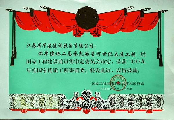 星河世紀大廈 時間:2010-01-19 8572 該工程位于深圳市福田區深南大道南與彩田路西交匯處,是深圳市中心區東門標志性建筑。該工程一裙三塔,32-39層,高173.2米,總建筑面積156680平方米,是集辦公、商業、住宅為一體的綜合樓。 該工程先后榮獲2006年度“深圳市安全生產文明施工優良工地”、2007年度深圳市優質工程“金牛獎”第一名、2007年度廣東省優良樣板工程獎、2007年度江蘇省“揚子杯”省外優質工程獎,2009年12月被評為2009年度國家優質工程銀質獎。