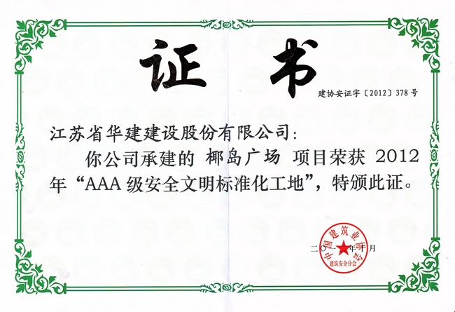 椰島廣場項目位于??谑旋埲A路,該工程總建筑面積115562平方米,其中地下室建筑面積20388平方米,1#-4#樓地上建筑面積58689平方米,建筑高度93.35米,5#-6#樓地上建筑面積36485平方米,建筑高度96.45米。工程于2011年4月30日開工,工期為480天。    2012年10月,該工程被中建協評為2012年“AAA級安全文明標準化工地”。