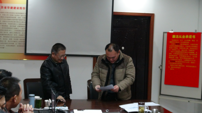 鹽城華建置業公司總經理繆文明、支部書記周群利代表全體員工表態:公司經營層要帶頭執行公司各項規定,遵紀守法,廉潔自律,把廉潔從業承諾書落到實處。